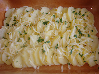 Preko mesa naređati na kolutove isečen krompir i šargarepu. Naliti sa pola litre vode ili pomešajte 3 dcl. vode i 2 dcl.belog vina. Dobro pokrite folijom i stavite u zagrejanu rernu, pa kad počne da vri smanjite na 150-200 stepeni i tako pecite oko 2 sata.